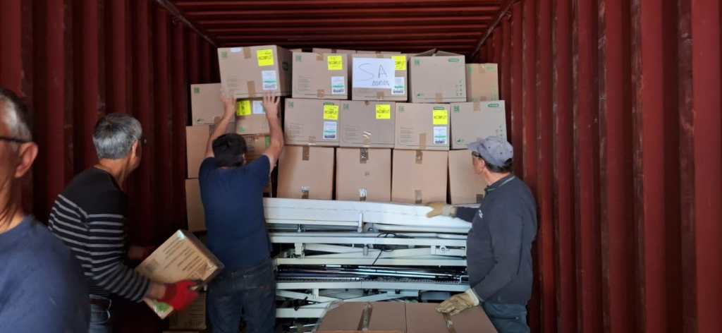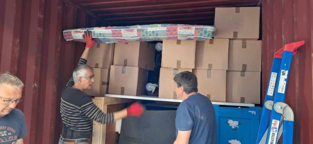 30/04/2025 : photos du chargement du 200ème conteneur, en direction de l’hôpital de Touba au Sénégal, à la base logistique de l’association à La Ville-aux-Clercs par notre équipe de bénévoles.